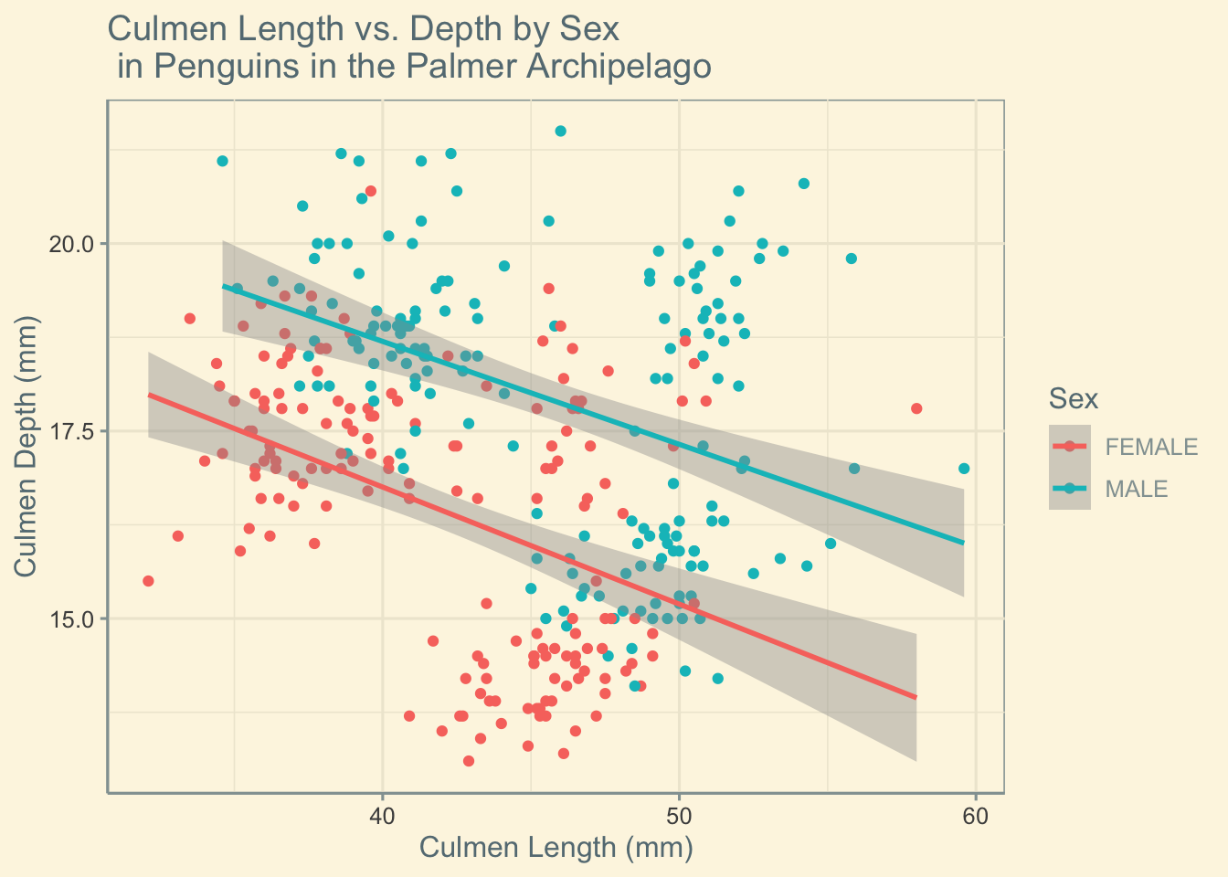 labs(x = "Culmen Length (mm)", y = "Culmen Depth (mm)", title = "Culmen Length vs. Depth by Sex \n in Penguins in the Palmer Archipelago") +