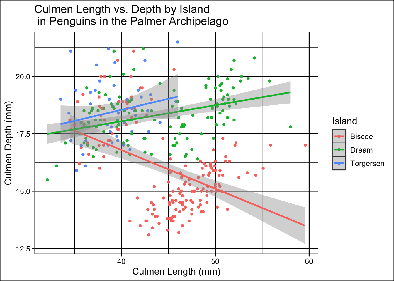 labs(x = "Culmen Length (mm)", y = "Culmen Depth (mm)", title = "Culmen Length vs. Depth by Island \n in Penguins in the Palmer Archipelago") +