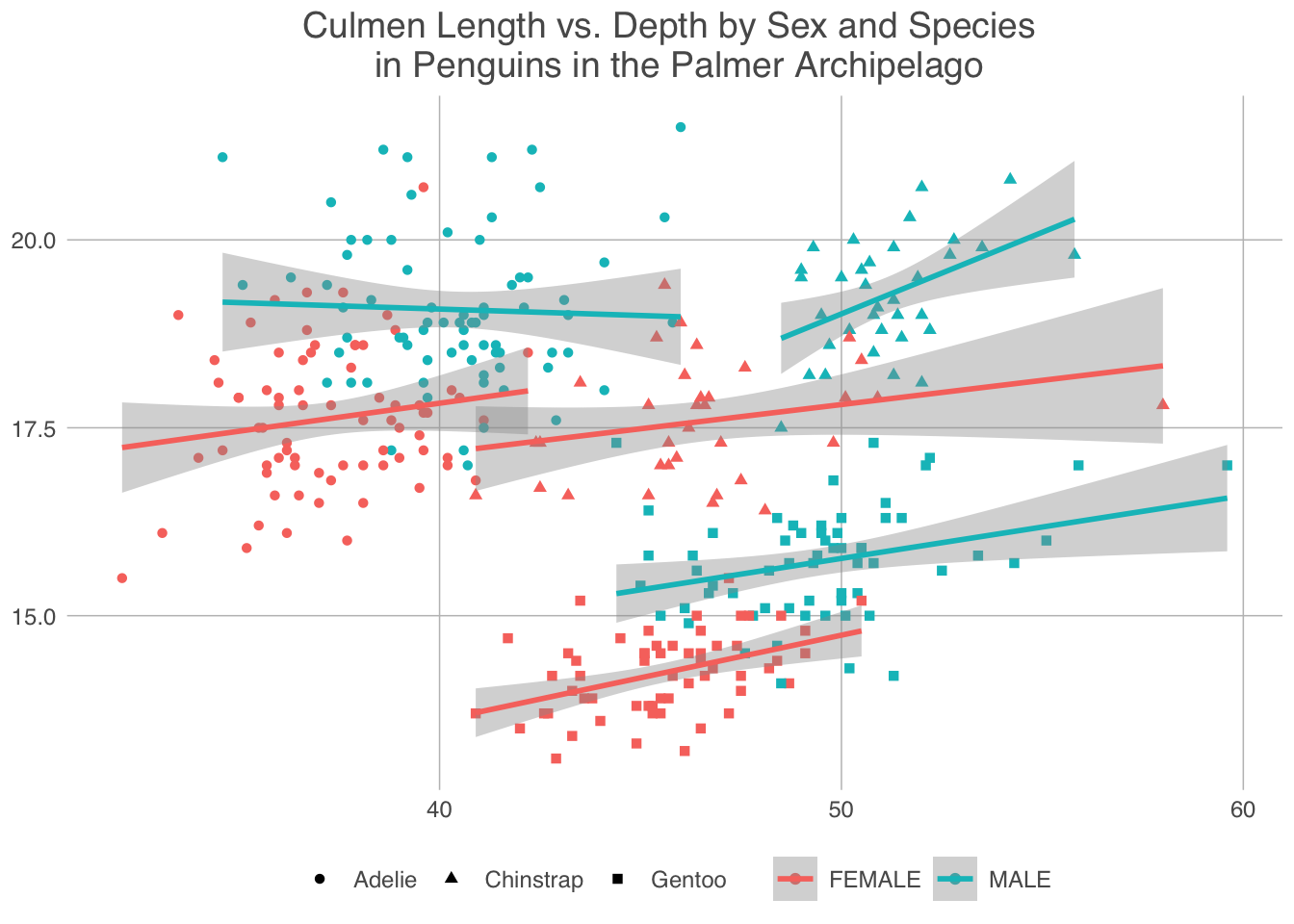 There’s nothing stopping us considering multiple factors on the same graph! One way to do this is to use the shape attribute i.e. change the shape of the point for each species. R will even create new lines of best fit for us for each combination! Sex is an obvious choice to do this with as we would reasonably expect differences between penguin sexes but not necessarily between the same species in different locations (although factors such as nutrition could make this the case).