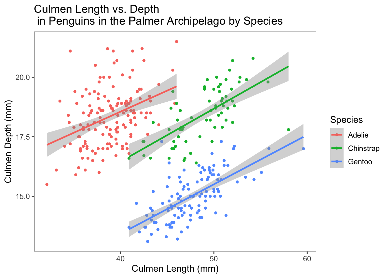 labs(x = "Culmen Length (mm)", y = "Culmen Depth (mm)", title = "Culmen Length vs. Depth \n in Penguins in the Palmer Archipelago by Species") +