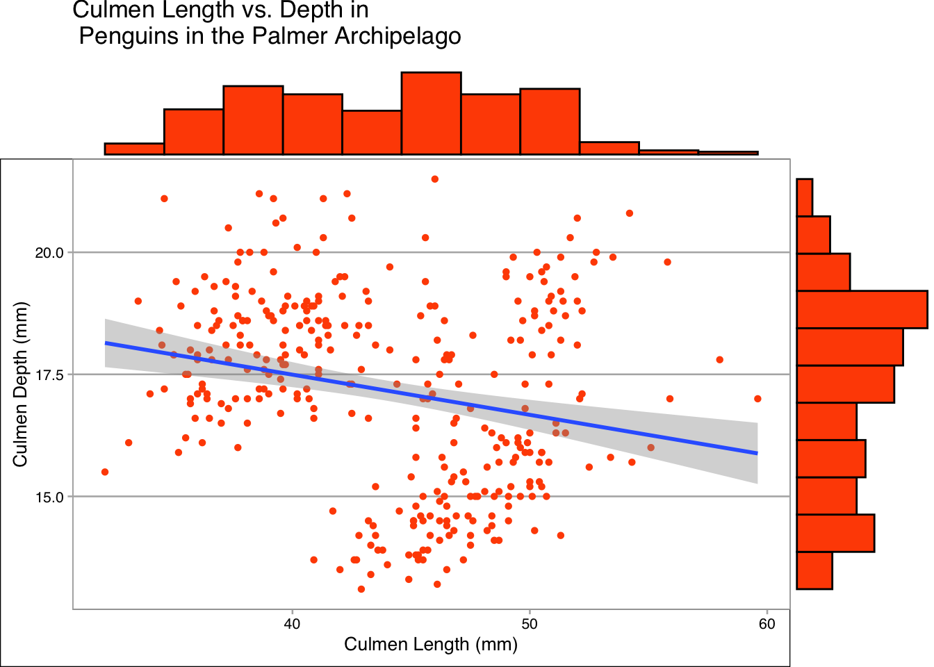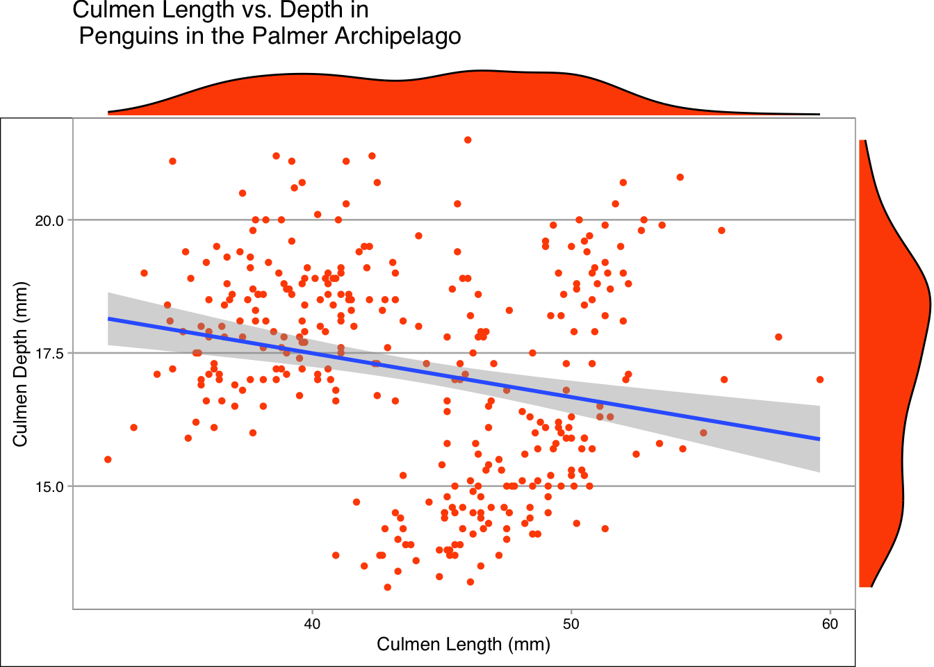 We can further improve our plot by adding marginal plots, with ggMarginal from the ggExtra package. These plots help us see the distribution of the data. We could make these plots separately but it can be nice to have this information in the same place as our main plot.