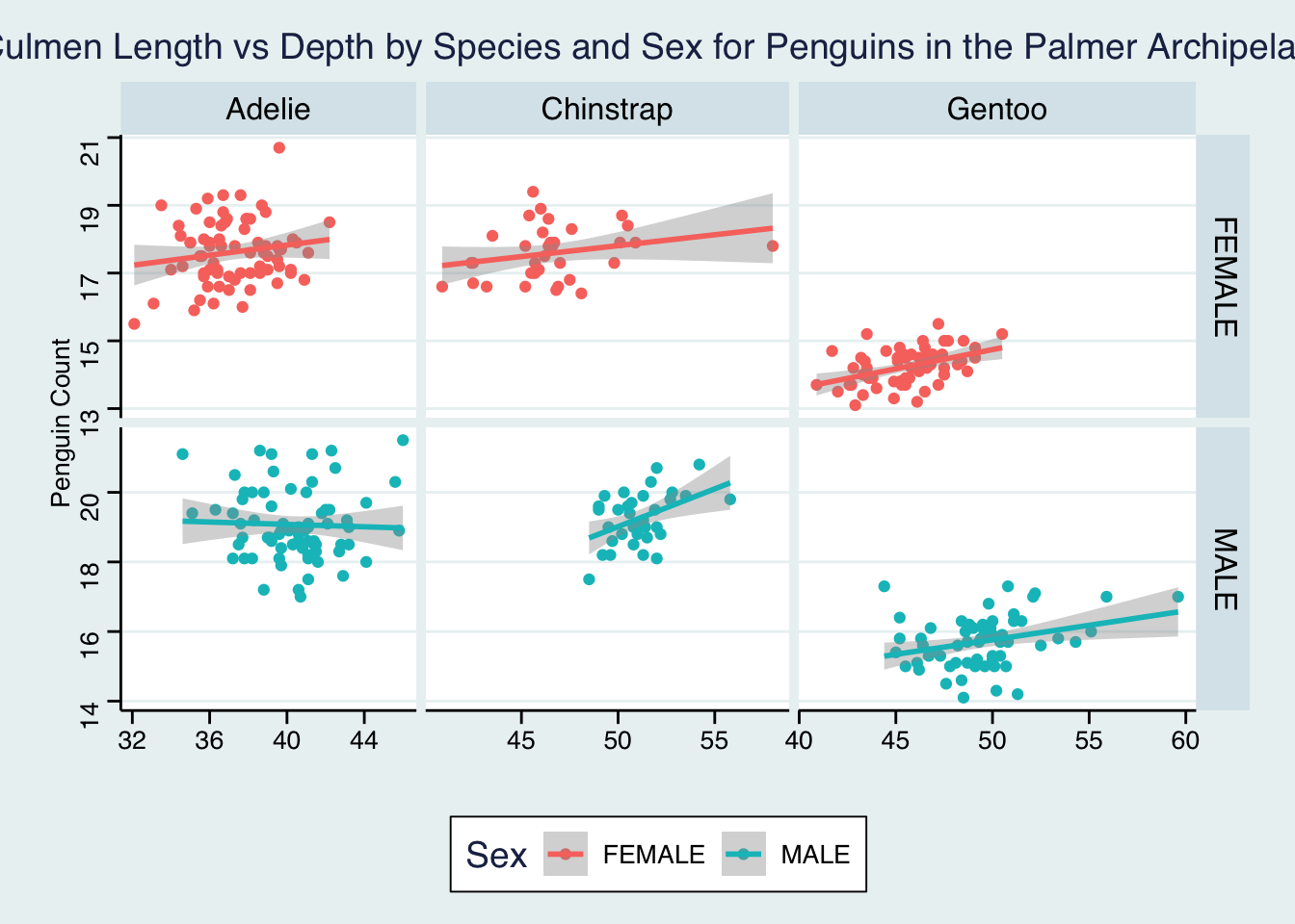 Looking at sex alone there is a clear difference in our lines of best fit. Correlation appears to be similar between the sexes however both culmen length and depth seem to trend larger in male penguins.