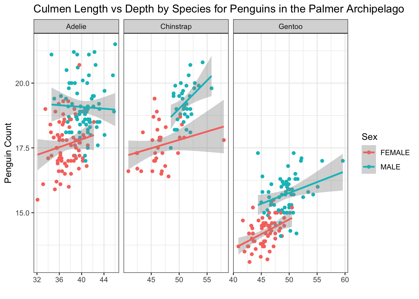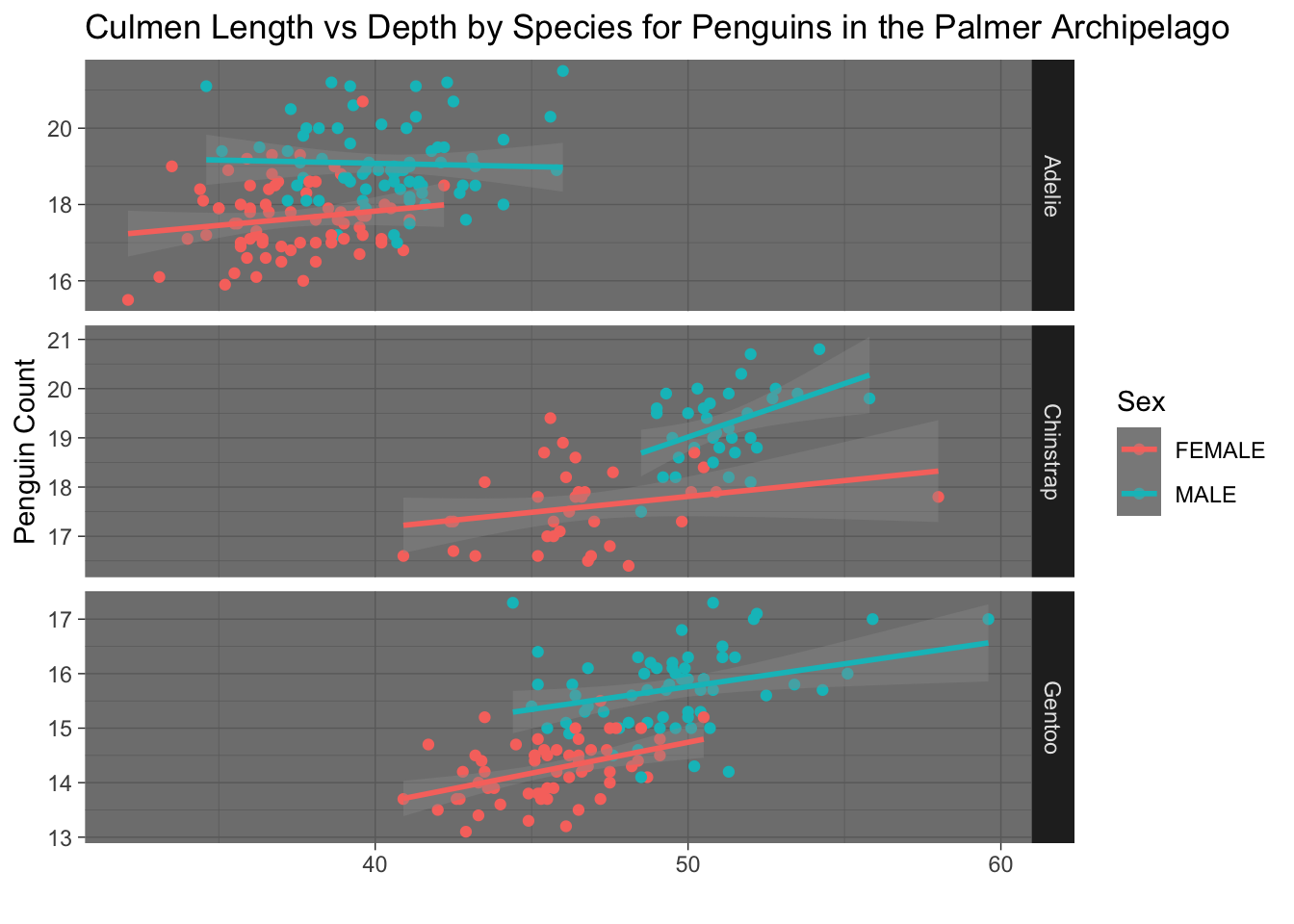 A similar patterns seems to emerge for each species by sex, however there is some slight strangeness. The linear model for male chinstrap penguins makes it appear like their culmen length increases at a greater rate with culmen depth than for female chinstrap penguins. This may be the case, but it may not. I think this highlights a key issue with splitting up data like this, as the size of the dataset you are working with decreases any attempt to make predictions with it become inherently less reliable.