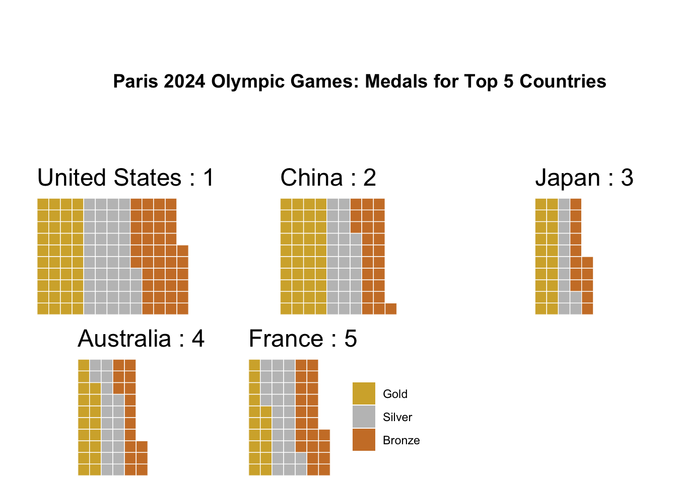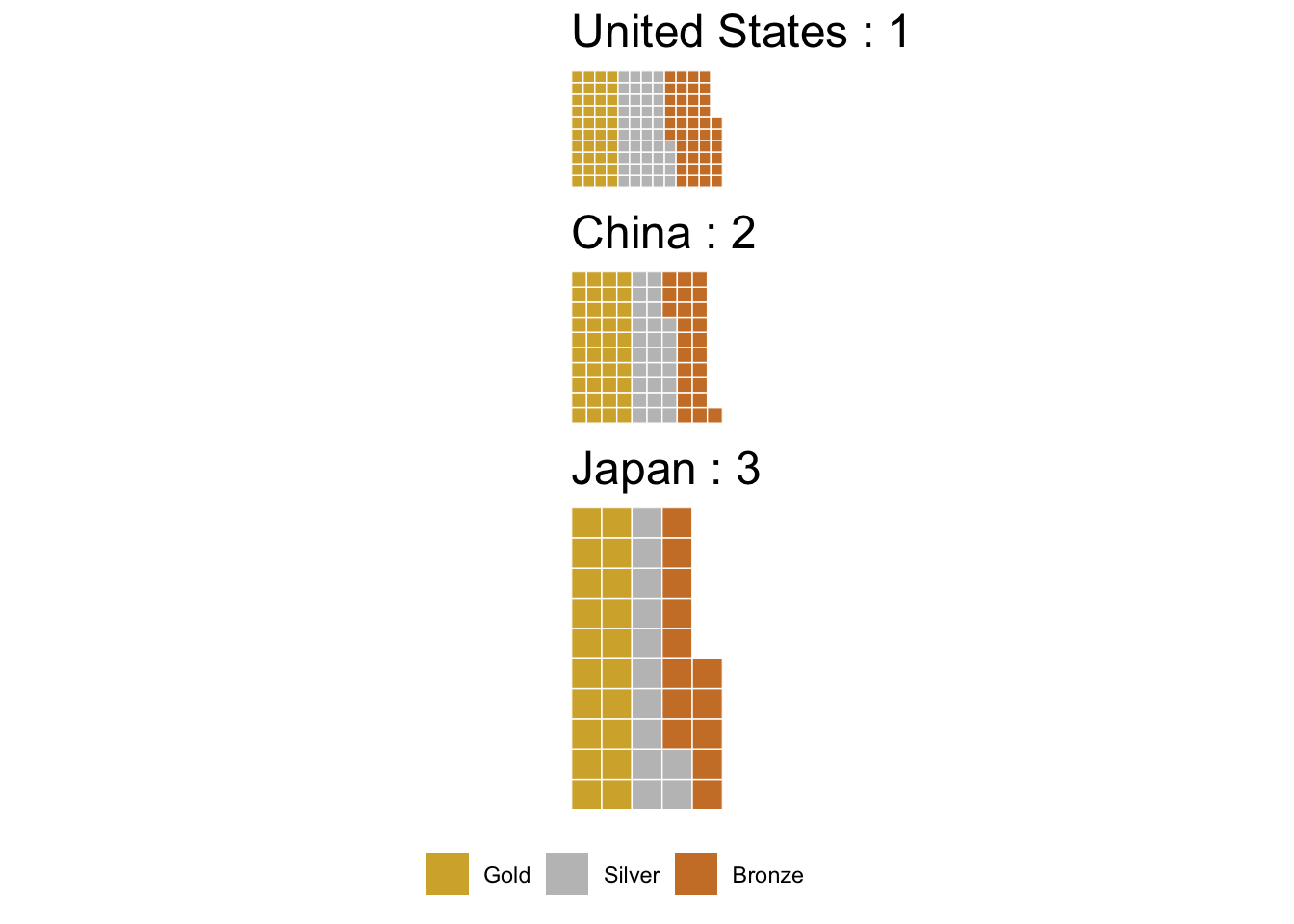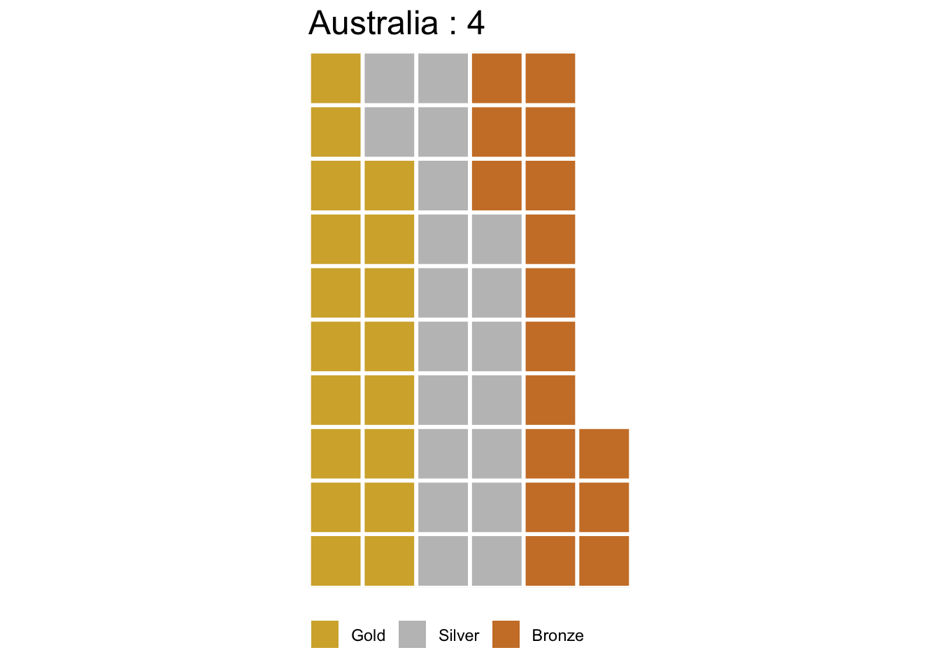 There we have it, our first waffle plot! Each square represents a medal won.