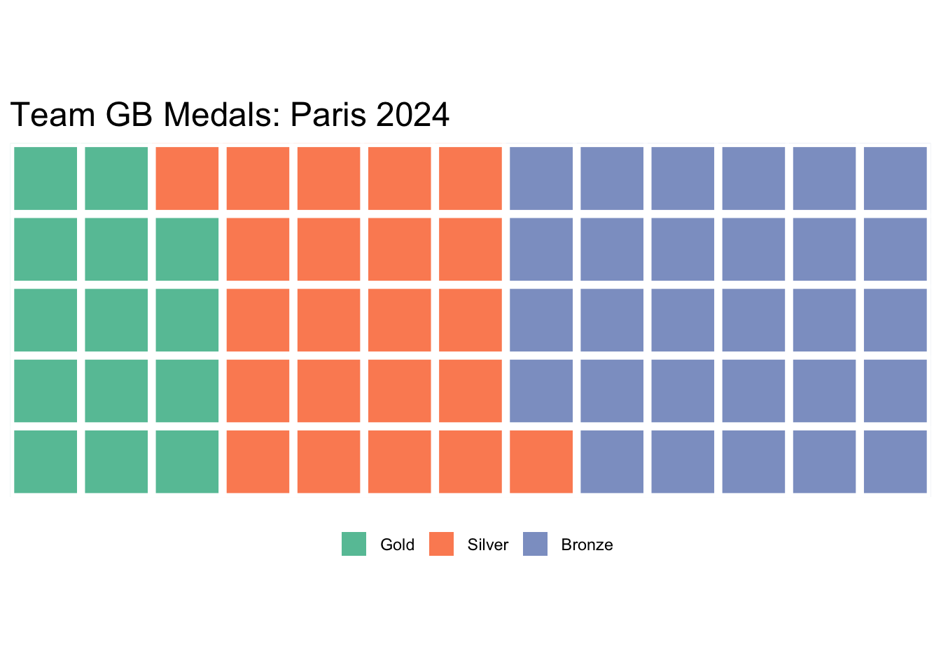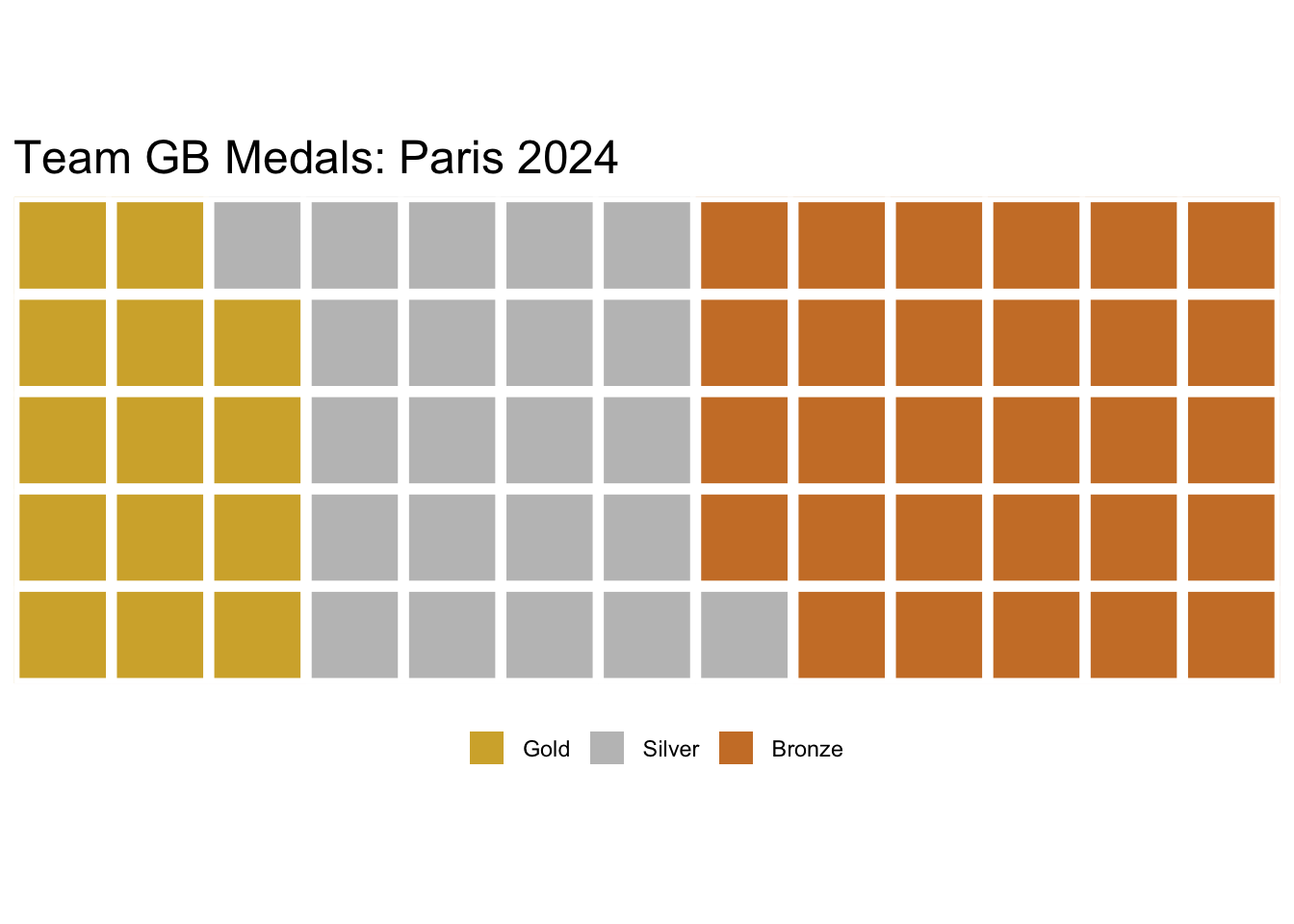 waffle(data.frame(GB_data$Medal, GB_data$Count), rows = 5,